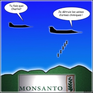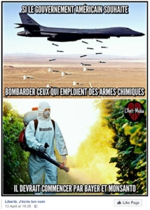 C’est le même symbole « gaz / chimique » qui permet de poser une équivalence entre Bachar al Assad et les multinationales. Ainsi ce genre de chose que l’on a pu voir circuler et qui font une équivalence entre le gazage des populations par Bachar al Assad et Monsanto Bayer.