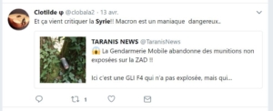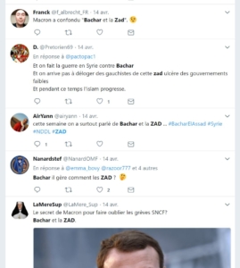 Depuis le 14 avril, des comptes pro-Assad et surtout FN diffusent de nombreux messages associant la question syrienne à celle de la ZAD. Mais au départ, il s’agit d’attaques contre les Zadistes, dont on demande l’évacuation violente. Les messages sont du type « Macron s’occupe de Bachar mais pas de la ZAD ». La propagande politique déployée est donc à la fois une dénonciation de l’intervention contre le massacre aux armes chimiques, et une exigence de répression accrue contre le mouvement social. Une position fasciste classique, qui conjugue le soutien à la dictature et la revendication d’élimination des forces progressistes au niveau national.