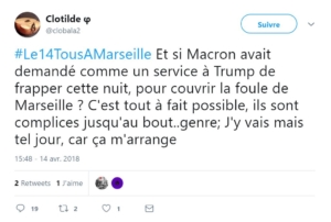 Dans le même temps, se développe dans d’autres sphères politiques un discours hostile aux frappes en Syrie. Il prend notamment la forme d’une dénonciation des frappes comme une stratégie du Président destinée uniquement à créer un sujet médiatique qui permette de « ne pas parler des vrais problèmes ». « Les frappes de Macron en Syrie c’est pour détourner l’attention de [insérez ici votre cause] », puis inévitablement arrive la dénonciation du deux poids deux mesures.