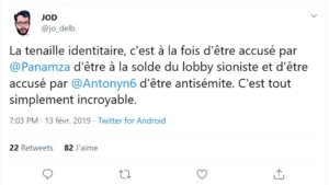 C’est pratique la « tenaille identitaire », ça permet de se faire passer pour un modéré en mettant dans le même sac ses ennemis et les extrémistes derrière qui on court. « Le CCIF = Eric Zemmour » et donc taper sur les Musulmans en répétant ce que dit Zemmour, de façon modérée, c’est en fait lutter contre Zemmour et contre les musulmans qui seraient une même « tenaille identitaire ». On peut faire d’une pierre deux coups: assimiler ses ennemis à un conspirationniste antisémite et s’inventer une médaille de lutte contre l’antisémitisme conspirationniste alors qu’on a couru derrière aussi vite qu’un Macron courant derrière le Pen.