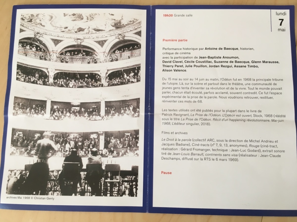 Ceux qui se revendiquent de « L’esprit de mai » devraient mettre en pratique les idéaux de 1968 qu’ils défendent dans leurs théâtres. Ils pourraient revoir leurs classiques lorsqu’ils organisent un événement pareil, en commençant par relire La société du spectacle de Guy Debord. On ne fait pas de cette révolte un divertissement payant, surtout pas à L’Odéon, symbole de cet « esprit de mai », investi par les étudiants comme arène politique ouverte à l’échange des idées, comme laboratoire d’expression des rêves, lieu de porosité entre la rue et la scène.
