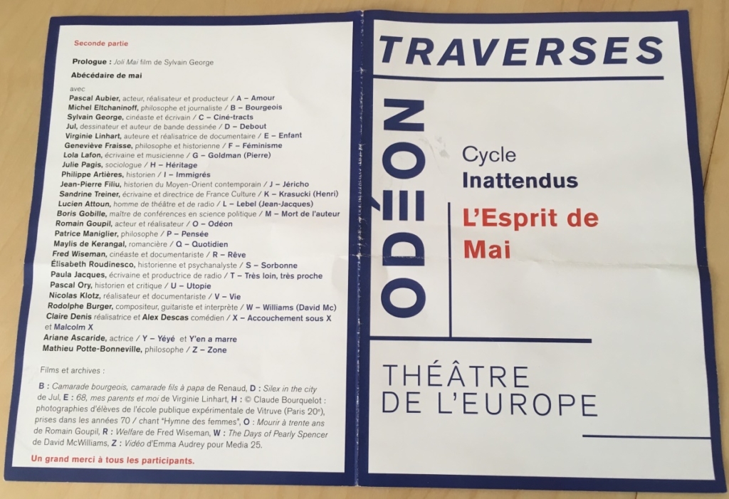 Hier soir à l’Odéon, une commémoration de mai 68 était célébrée. Ce lieu fut le théâtre de cette revolution rendant l’utopie possible dans la lutte contre l’asservissement aux structures imposées et la quête de nouvelles plus adaptées aux hommes. Dehors, des étudiants demandaient à entrer gratuitement. Après tout, il s’agissait de mai 68, pas d’un produit culturel marchandable. Les organisateurs ne savaient-ils pas que les manifestations étudiantes actuelles faisaient écho aux évènements d’il y a cinquante ans?